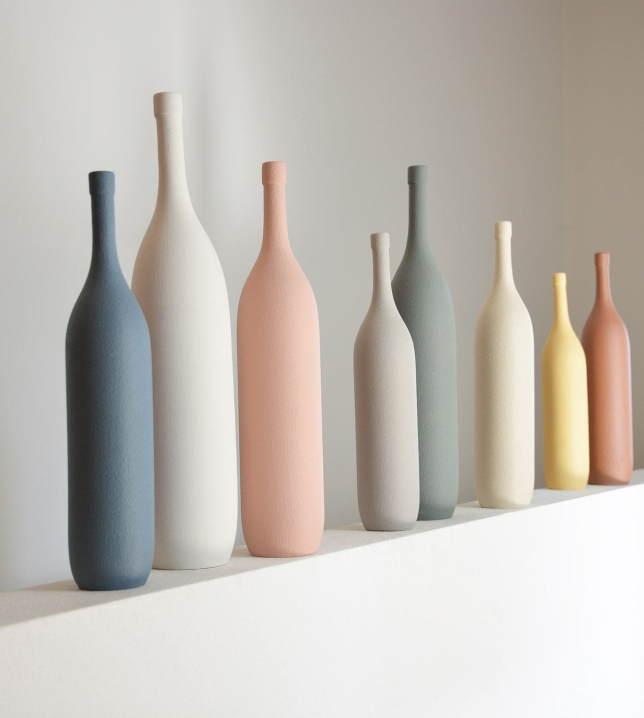 Bottles inspired by the artist Giorgio Morandi: solid and imposing, as in his paintings, they are the undisputed protagonists of the scene. Available in three different sizes, they can be combined in monochrome or dynamic color palettes. Their elegant silhouette makes any environment refined and welcoming.